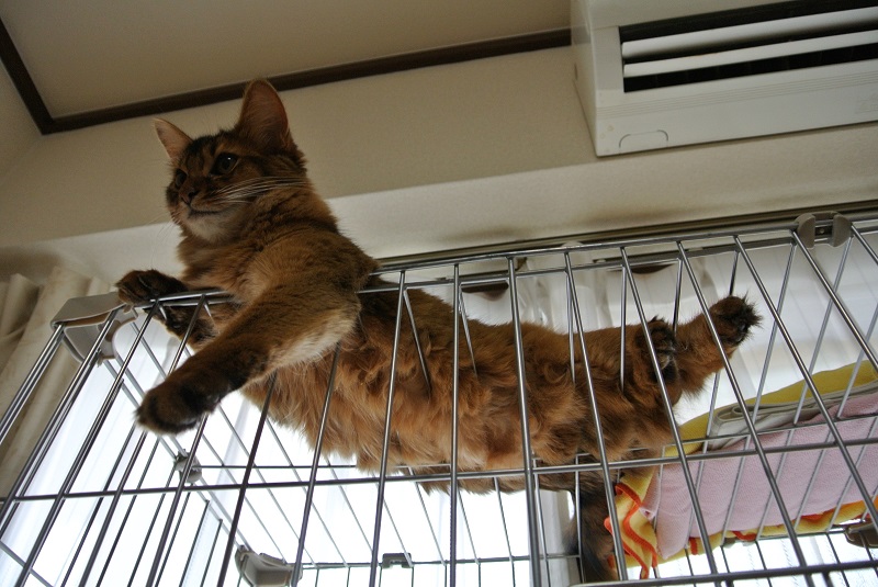 ここのところ、上下運動が激しくて、ケージの外側を木登りの要領で登っちゃうため、ケージが揺れて怖いです((((;゚Д゚))))
