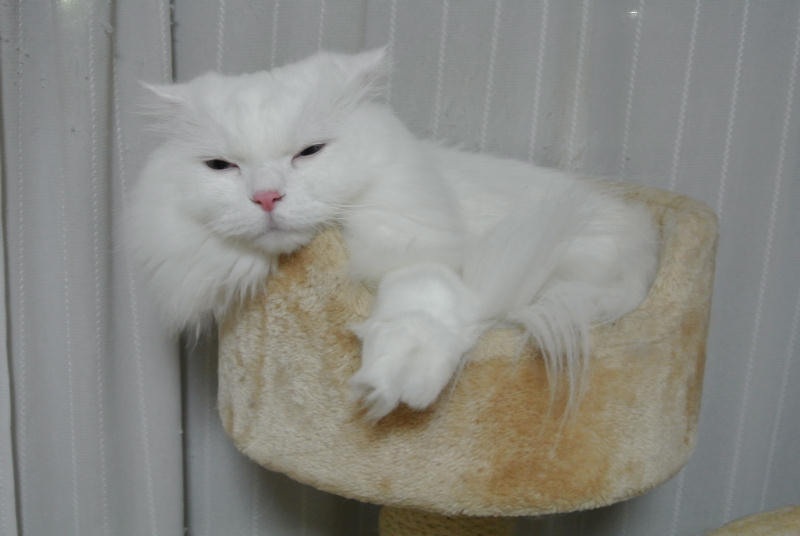 王子の部屋(浴室のこと。タイルがひんやりして気持ちいいらしい)が占拠されたうえ、水浸しになってしまったため、冷え冷えのお部屋のキャットタワーでくつろいでいました。