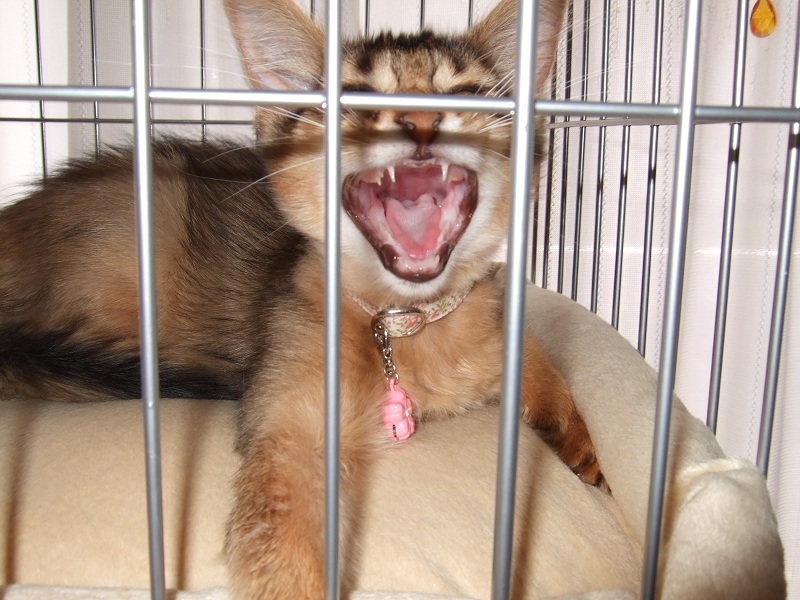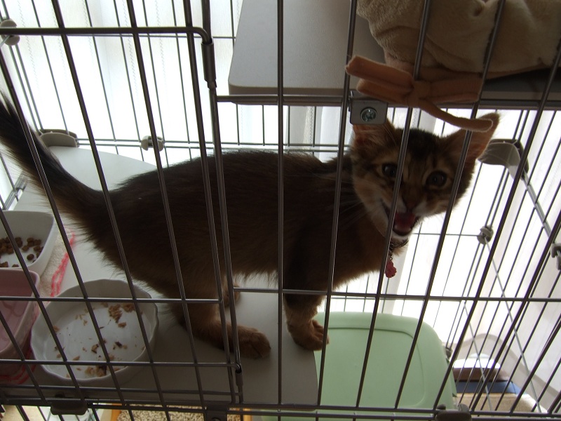 逃げる社長を追って七実様のケージ近くでブラッシングしていると、「あんあん!」と、犬のような鳴き声で抗議する七実様。