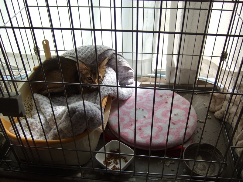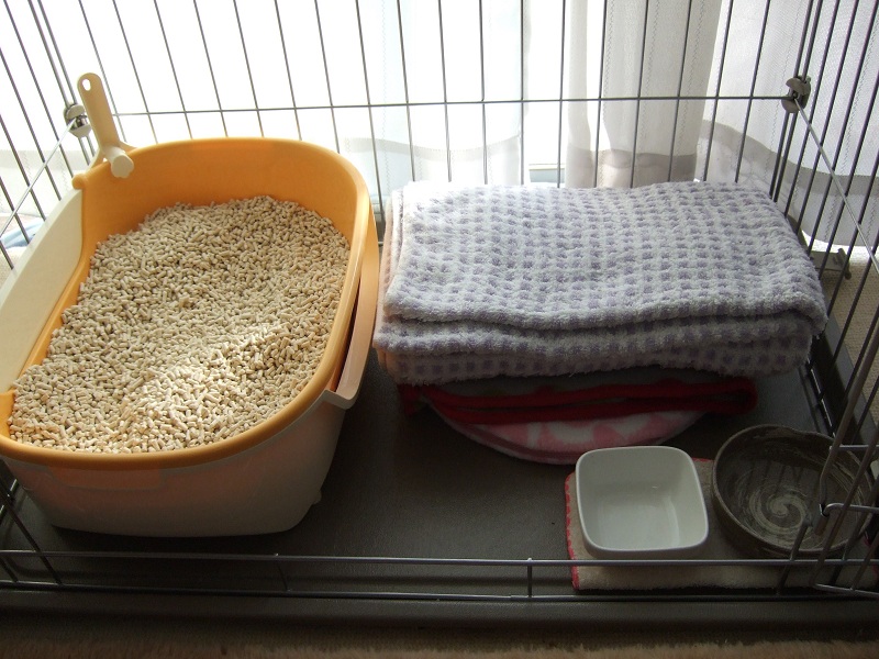 我が家に来た初日に、秘書が用意したバスタオル+親兄弟のにおいのついた布を使っていたのですが、お水をよくこぼすのでバスタオルが濡れてしまい、真ん中の段で干していたのでした。