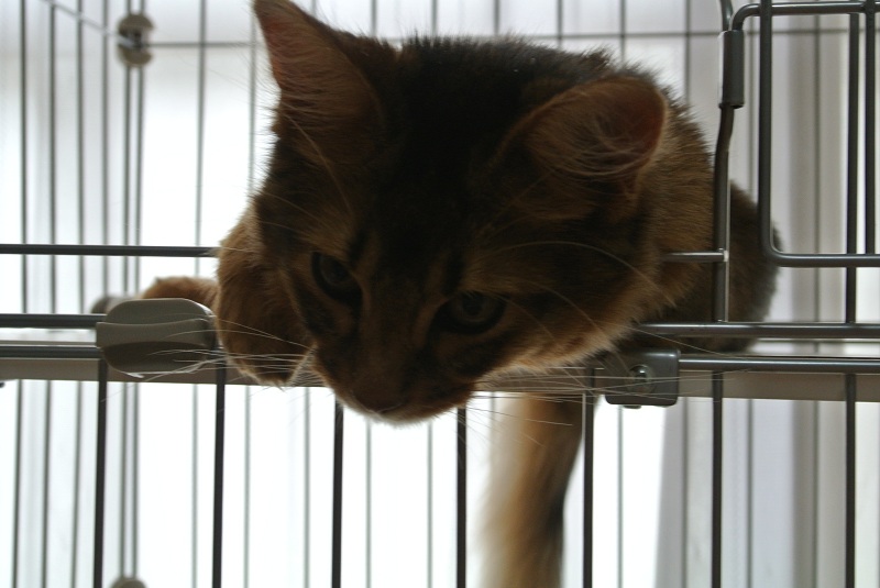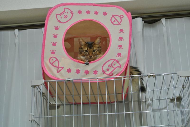 今日は、ケージの真ん中の棚板に乗ってから、外の横網を利用して、上に置いてあるキャットプレイキューブの中に潜り込んで、おもちゃを物色するという遊びにはまってましたorz