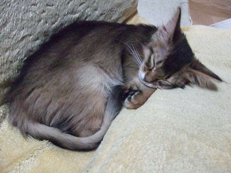午前中、七実お嬢様は秘書めのマイクロファイバー膝掛けの上で気持ちよさそうに眠っておられました。