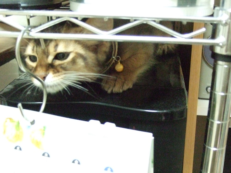 右側のPC机の裏に入れなくなった代わりに、PCラックの真ん中のPCに無理矢理乗る七実様。…狭いのにわざわざお疲れ様(;´∀`)