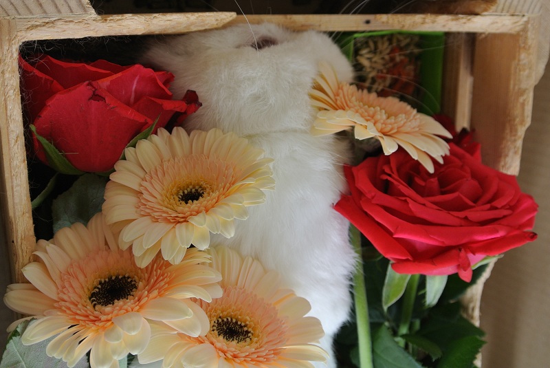 家族の事情でバタバタしてしまい、十分にお花を選んであげることができませんでしたが、社長の目と同じ色の赤いバラと、ベージュに近いガーベラだけ添えました。