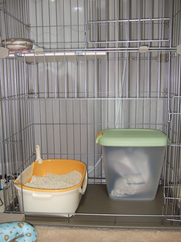 また、真ん中の段にお水とカリカリを置くことで、寝てばかりいる七実様がふと目を覚ました時でも、お水を飲んだりごはんを食べたりできるようになりました。